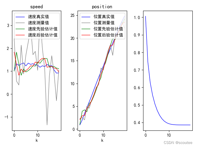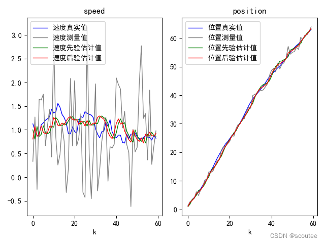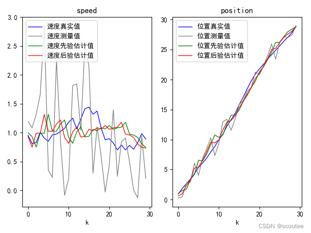 # 把k时刻后验预测值赋给两个状态分量的后验预测值 speed_posterior_est = X_posterior[1,0];position_posterior_est = X_posterior[0,0]
