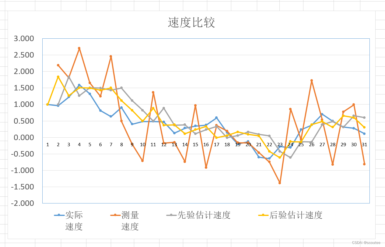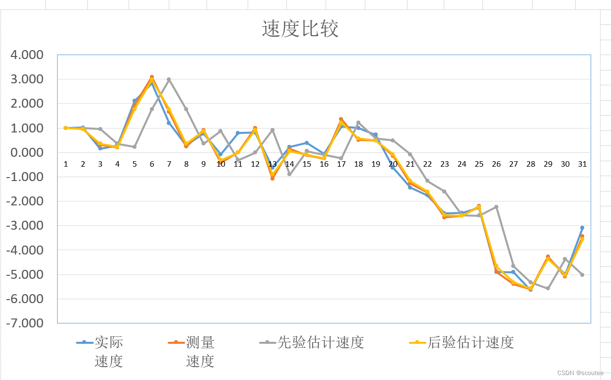 真实的实际速度是蓝色曲线,最终的估计速度即为后验估计速度,是黄色曲线。对比它们之间的偏差能够看出估计值与实际值之间的误差,从而判断算法的准确度。