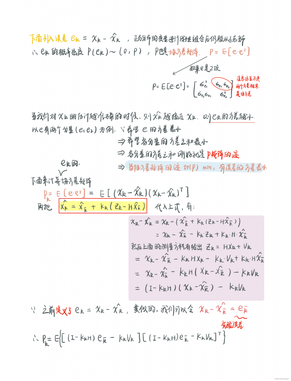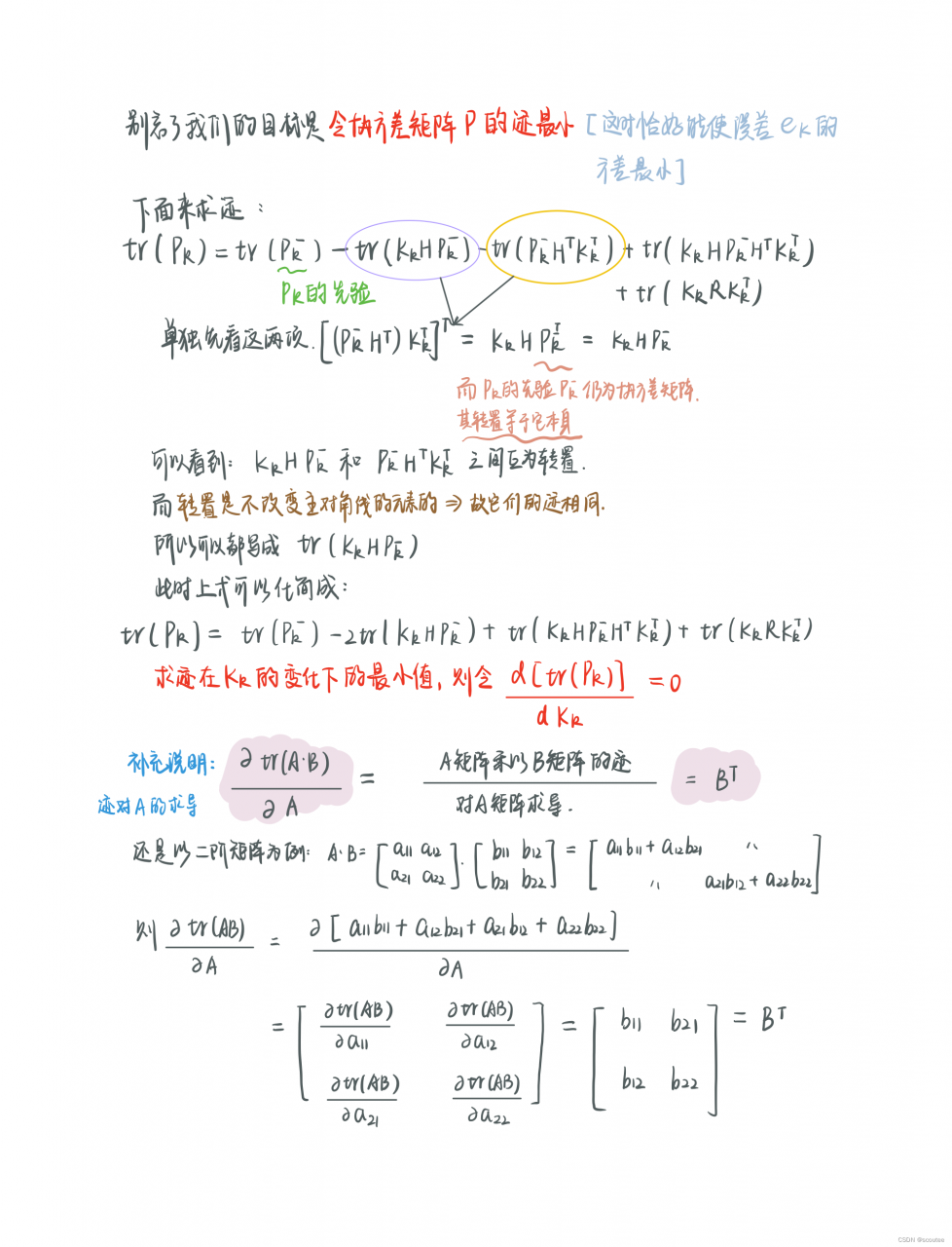 进一步推导,考虑到误差ek会有很多不同的分量(因为状态量不同,比如说此例子中就是有状态量X1表示位置,状态量X2表示速度,那么它们就分别有误差e1和e2)。要使得总误差方差最小,那么误差各个分量的方差之和加起来就要最小。而“误差各分量的方差之和”正好是误差的协方差矩阵的主对角线之和——迹。