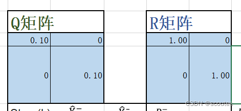 # Q[0,0]是过程噪声w的协方差矩阵的第一行第一列,即w1的方差,Q[1,1]是协方差矩阵的第二行第二列,即为w2的方差