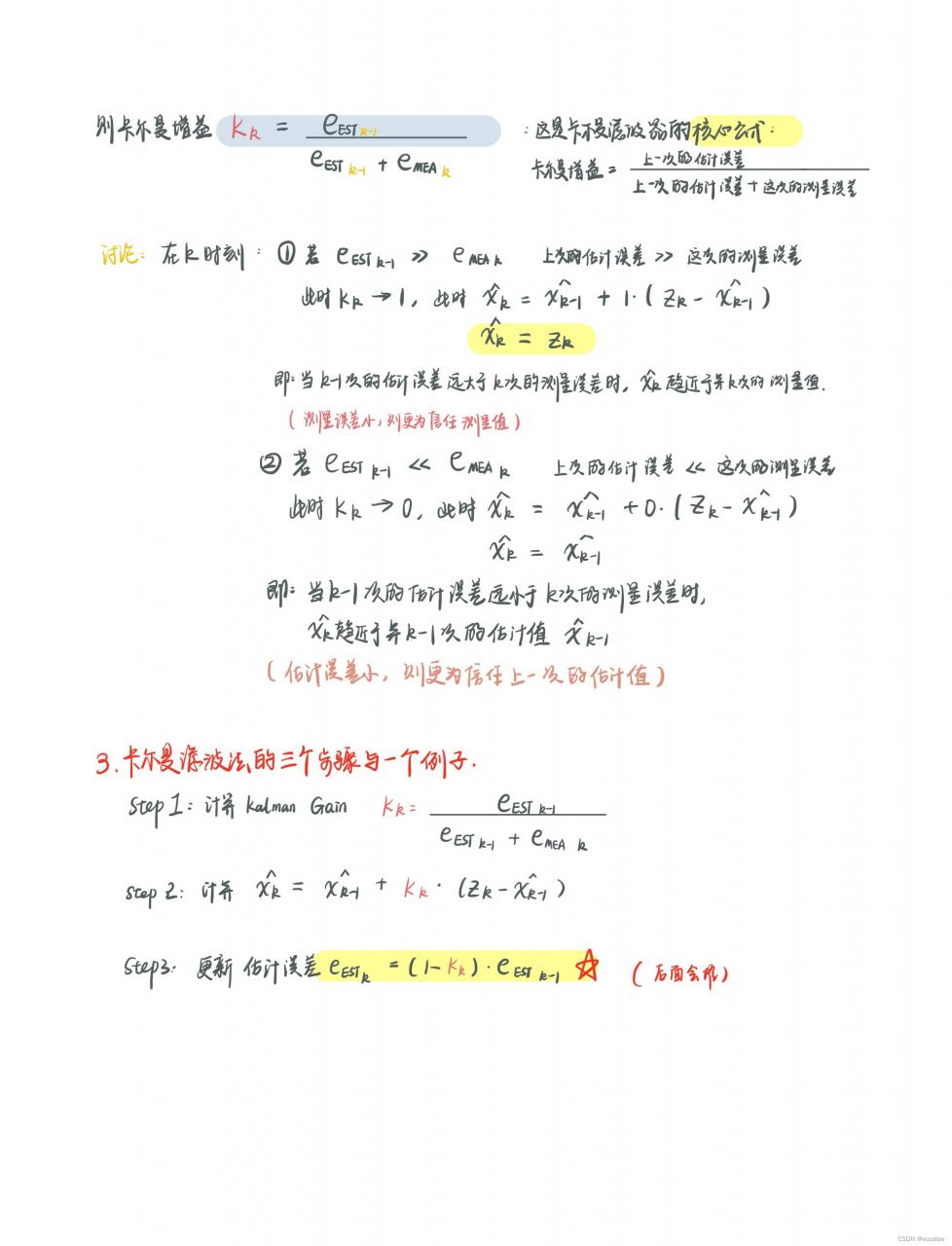 下面具体看一下,之前反复提到过:如果模型计算误差Wk小,最终的估计值就更偏向计算值;