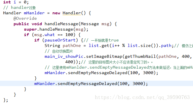 这里判断上面传过来的值,如果相等做相应操作,mHanlder.sendEmptyMessageDelayed(100, 3000);