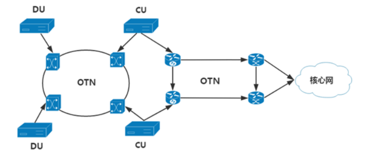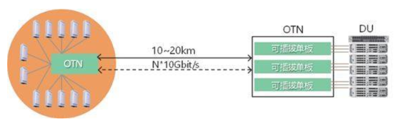 在AAU站点和DU机房中配置相应的WDM/OTN设备,多个前传信号通过WDM技术共享光纤资源。相比无源WDM方案,组网更加灵活(支持点对点和组环网),同时光纤资源消耗并没有增加。