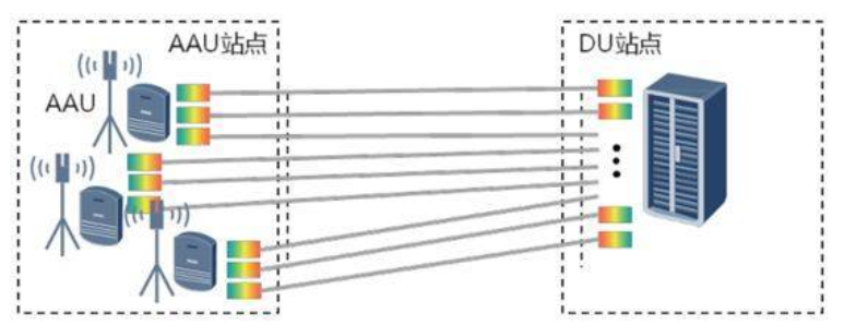 每个AAU与DU全部采用光纤点到点直连组网。实现起来很简单,但最大的问题是光纤资源占用很多。随着5G基站、载频数量的急剧增加,对光纤的使用量也是激增。所以,光纤资源比较丰富的区域,可以采用此方案。
