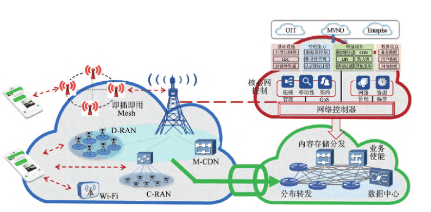 红色的控制云,实现网络控制功能集中,网元功能具备虚拟化、软件及其重构性,支持第三方网络能力开放。