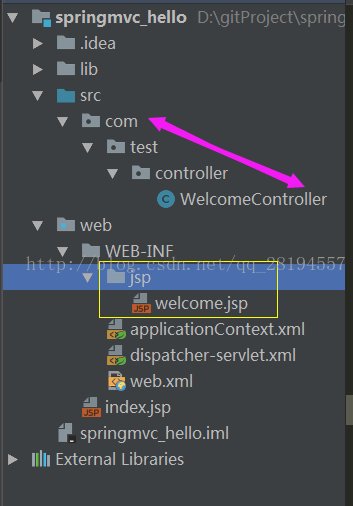 其中,class="com.test.controller.WelcomeController"表示的是src下的路径。