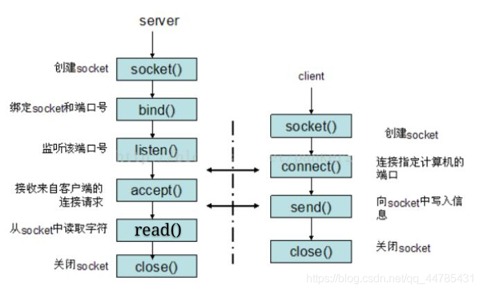 服务器先创建socket(socket),然后绑定socket和端口号(bind),对端口号进行监听(listen),调用accept阻塞,接受来自客户端的连接请求(accept)。这时,如果客户端创建socket(socket),连接到指定计算机的端口(connect),如果连接成功,这时客户端与服务器端的连接就建立了。这时客户端向socket中写入信息(send),服务器端从socket中读取字符并处理(read),然后把回应数据发送给客户端,客户端读取数据,最后关闭连接(close),一次交互结束,这就是服务器和客户端一次完整的网络通信。