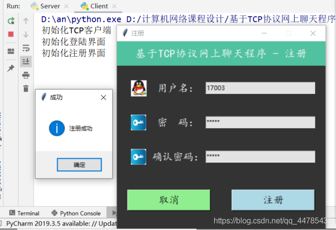 用户注册成功后,关闭提示“注册成功”,会自动从注册界面跳转到登录,用注册的用户名和密码进行登录。