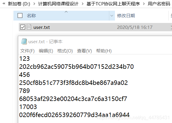 查看保存用户名和密码的user.txt,检查刚才的注册是否成功,其中密码采用MD5算法加密。