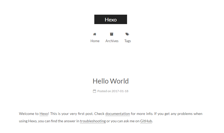 到这一步如果将hexo放到github page,那么使用github.io访问的将是一个默认的页面。下面我们要把他diy成自己的博客,包括导入模板主题等。