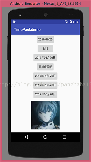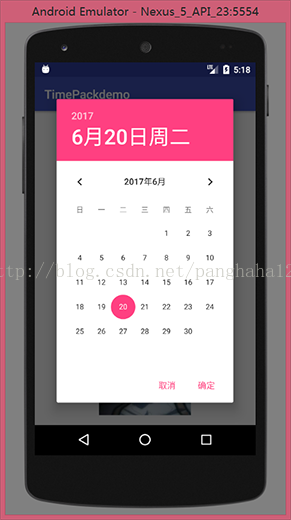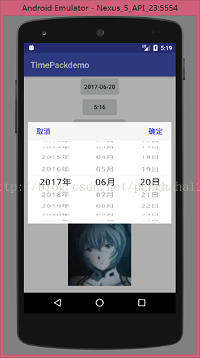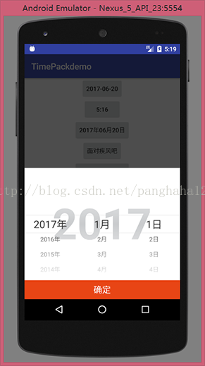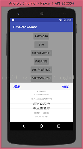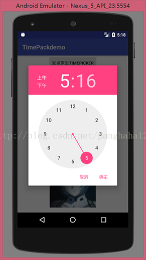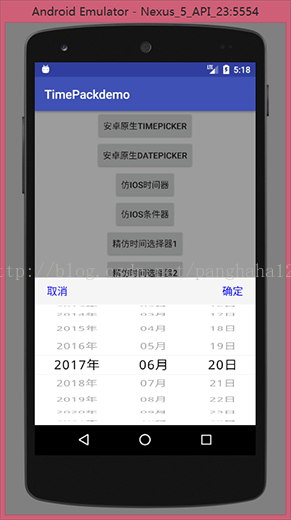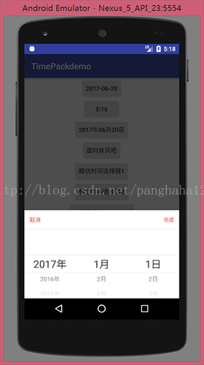TimePickerDialog dialog = new TimePickerDialog(MainActivity.this, new TimePickerDialog.OnTimeSetListener() { @Override public void onTimeSet(TimePicker view, int hourOfDay, int minute) { button2.setText(String.valueOf(hourOfDay+":"+minute)); } },calender2.get(Calendar.HOUR),calender2.get(Calendar.MINUTE),false); dialog.show();DatePickerDialog和TimePickerDialog都是原生带的,在5.0之前还是和ios那种效果差不多,来回上下滑选择日期的,但是5.0后就成日历了,虽然好看,不过占比屏太大,设计并不会考虑这种效果,哎,现在很多安卓的控件原生其实效果不错的,不过还是得为了遵循产品和设计的意思做成仿ios效果(小小的抱怨一下)