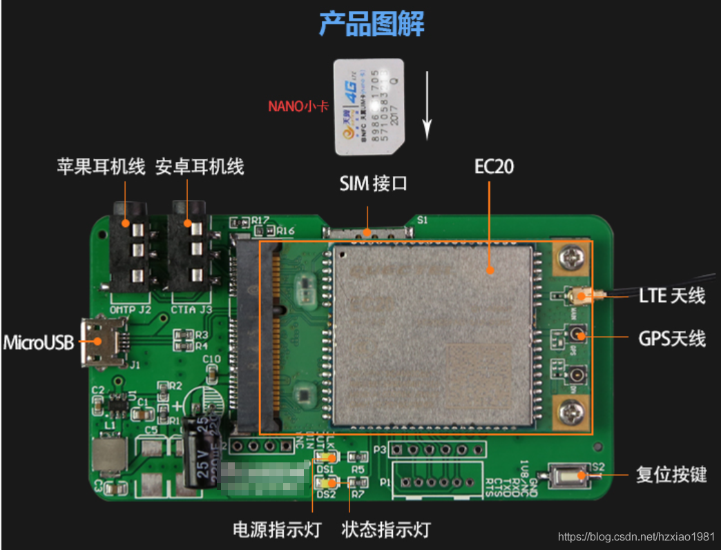 EC20模块为全功能模块,即除了4G全网通外还支持GPS功能,支持语音通话功能。如果要语音通话可以直接连接安卓或者苹果的3.5mm耳机线,然后通过AT命令进行接听或者拨号。