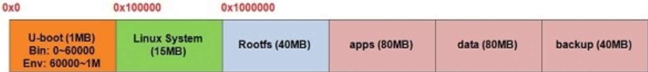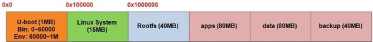 u-boot的烧录地址应该是 0,大小不超过1M。该分区对应Linux内核分区表的/dev/mtdblock0;Linux内核的烧录地址应该是0x100000(1M的偏移量处),大小不超过15M。该分区对应Linux内核分区表的/dev/mtdblock1;根文件系统镜像的烧录地址应该是0x1000000(16M的偏移量处),大小不超过40M。该分区对应Linux内核分区表的/dev/mtdblock2;