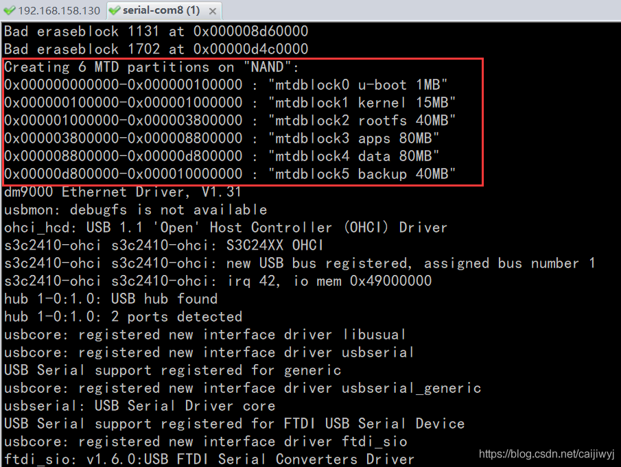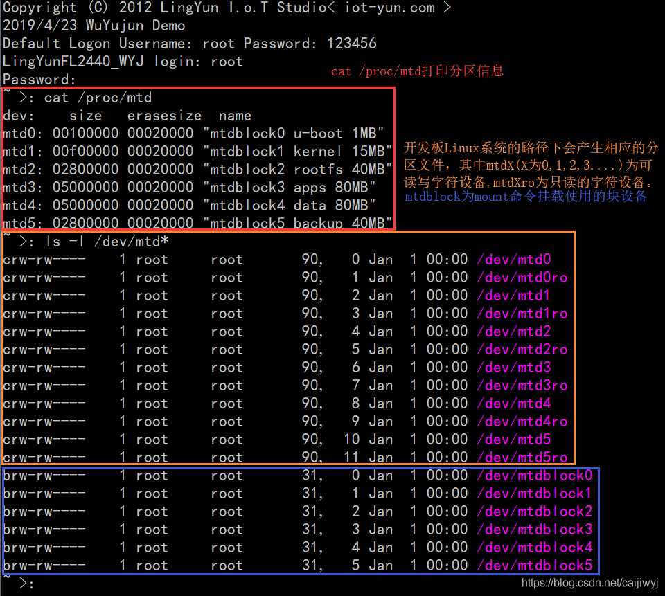 开发板Linux系统的路径下会产生相应的分区文件,其中mtdX(X为0,1,2,3....)为可读写字符设备,mtdXro为只读的字符设备,mtdblockX为mount命令挂载使用的块设备。
