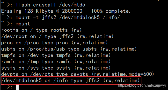 ~ >:mount -t jffs2 /dev/mtdblock5 /info/ 挂载mtdblock5分区到/info/目录下