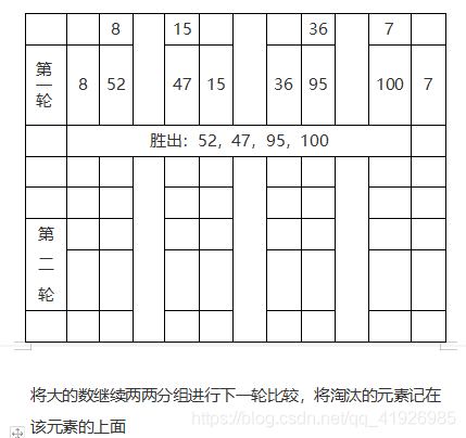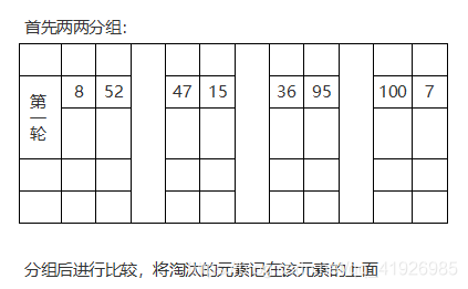 1、首先进行两两分组比较,大的数进入下一轮;被淘汰的数标记在淘汰它的元素的上方