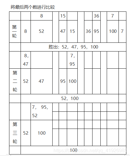 我们看到100是最大的那个数,然后我们把被100淘汰的数7,95,52里面找一个最大的数95,这个数就是数组中第二大的数。