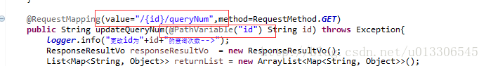 另外,还有一种应用场景,接口规范为resultful风格时,举个例子:如果要获取某个id下此条问题答案的查询次数的话,则后台就需要动态获取参数,其注解为@PathVariable,并且requestMapping中的value应为value="/{id}/queryNum",截图如下:
