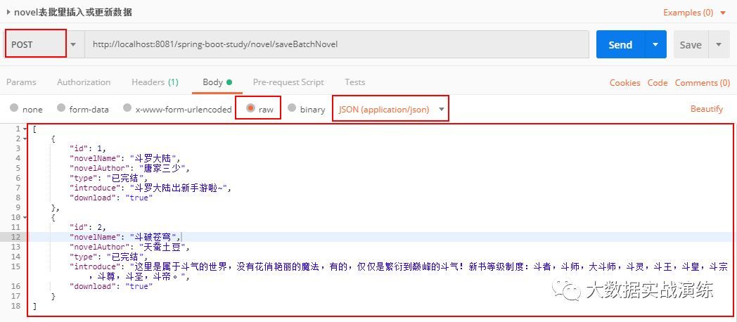 批量向表中插入两条数据,这里的 saveBatchNovel()方法已经封装了 JPA的 saveAll() 方法。body 里面的 json 语句的 key 值要与后端实体类的属性一一对应。