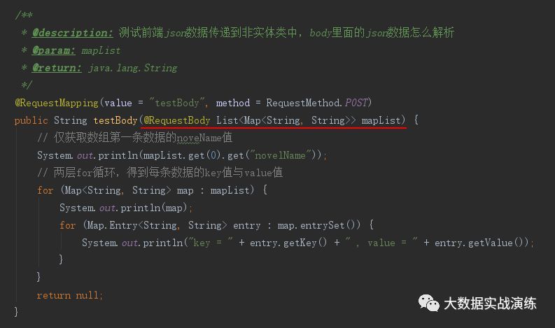 上述示例是传递到实体类中的具体写法,那么如果传递到非实体类中,body里面的json数据需要怎么解析呢?我们再来看下面这个例子: