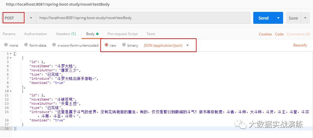 由于@RequestBody可用来处理 Content-Type 为 application/json 编码的内容,所以在postman中,选择body的类型为row -> JSON(application/json),这样在 Headers 中也会自动变为 Content-Type : application/json 编码格式。body内的数据如下图所示: