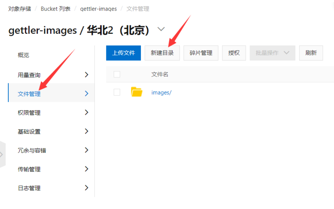 - 点击bucket列表,点击新建的bucket,在文件管理菜单中选择新建目录,新建一个文件夹images