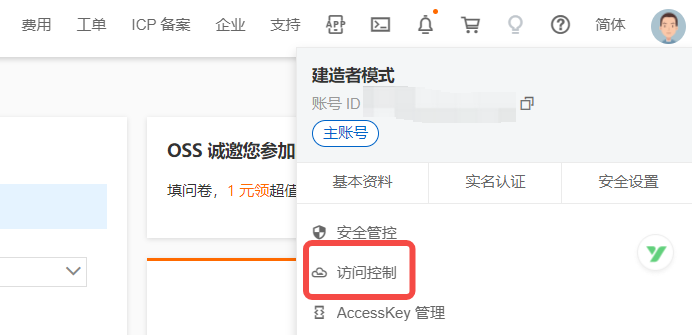 - 然后创建用户,鼠标放到右上角头像,点击访问控制