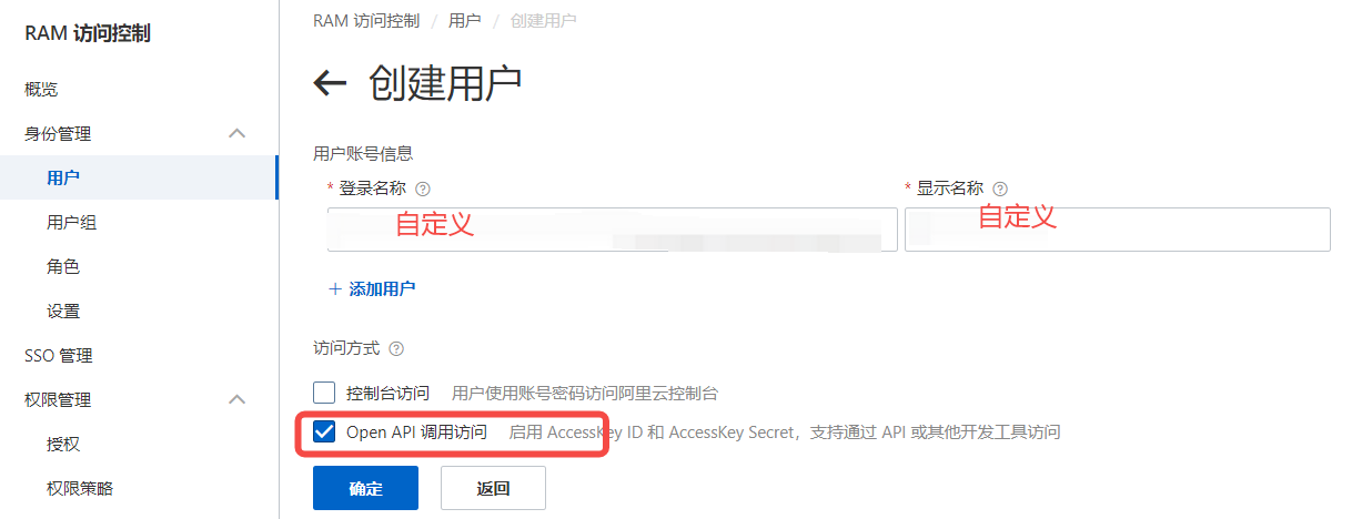 - 进入后左侧菜单点击用户,创建用户,选择Open API调用访问