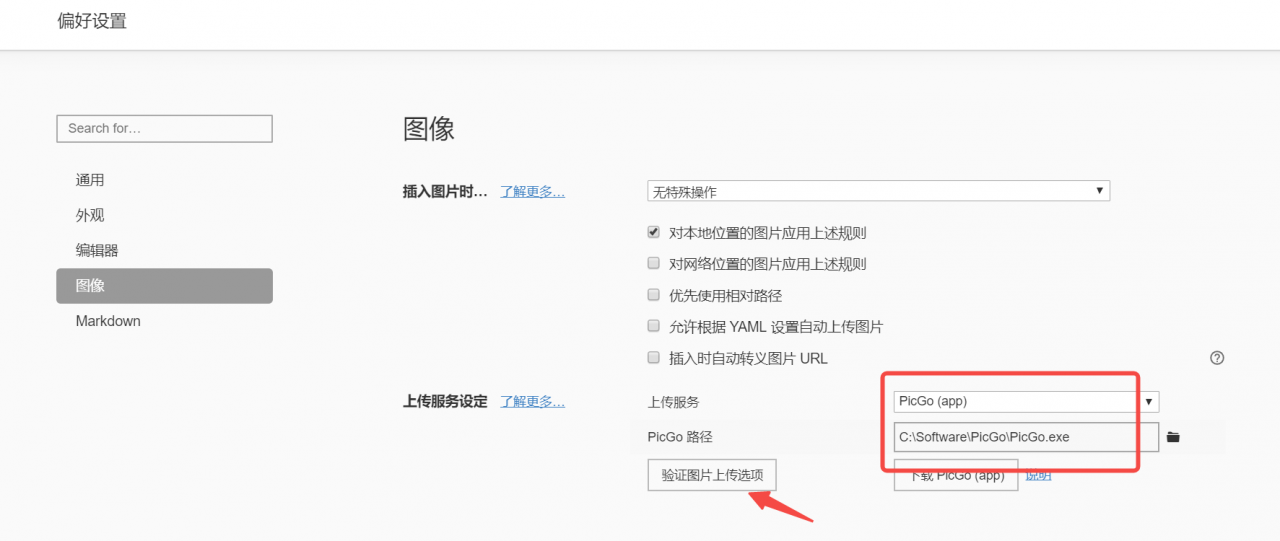 - 点击图像,按如下配置进行设置,配置完成之后,重启Typora。
