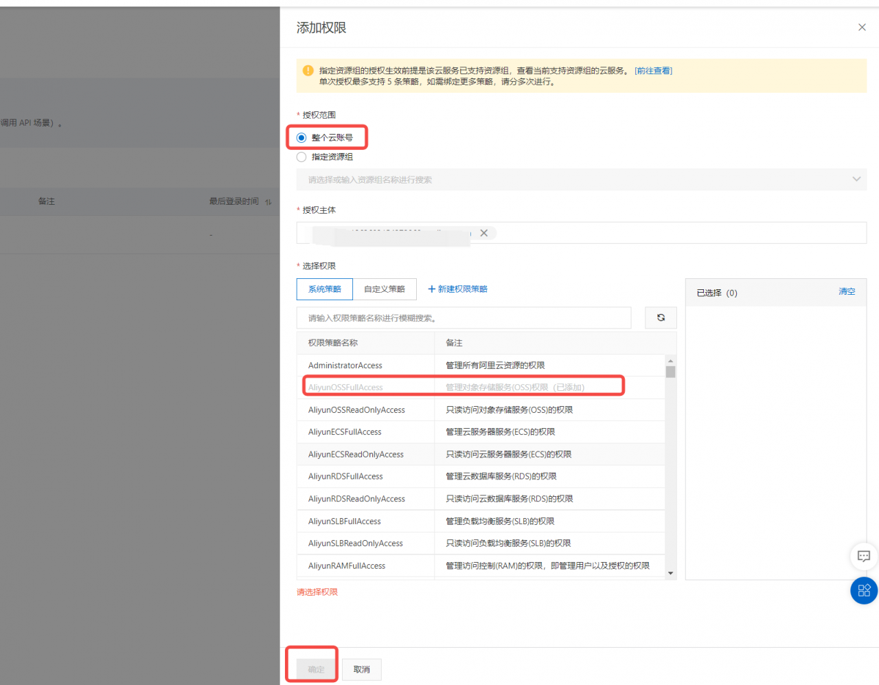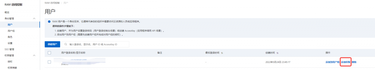 AccessKey ID和AccessKey Secret - 返回用户列表,点击添加权限