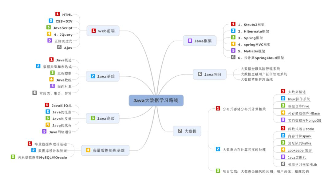 下图是Java大数据学习的线路图,初学者需要按照标注的模块1、2、3、4、5….按顺序学,例如“7”模块即“大数据模块”,其中包括“分布式存储分布式计算相关”和“大数据内存计算”。有人问:我基础好,可不可以越过“web前端模块”?答曰:不可以,除非你以前就系统的学习过。又问:学习web前端何用?答曰:为了最终做数据展现用,下图列出的是作为数据展现的最低要求,当然你的学习可以多于下图列出的内容,但是多年经验告诉你,下图基本是Java大数据性价比最优的体系,有了基础后可到企业边工作边学。为了让大家看清楚该图,我们将附上图片或者您可以放大观看:想系统学习大数据的话,可以加入大数据技术学习扣扣君羊:522189307