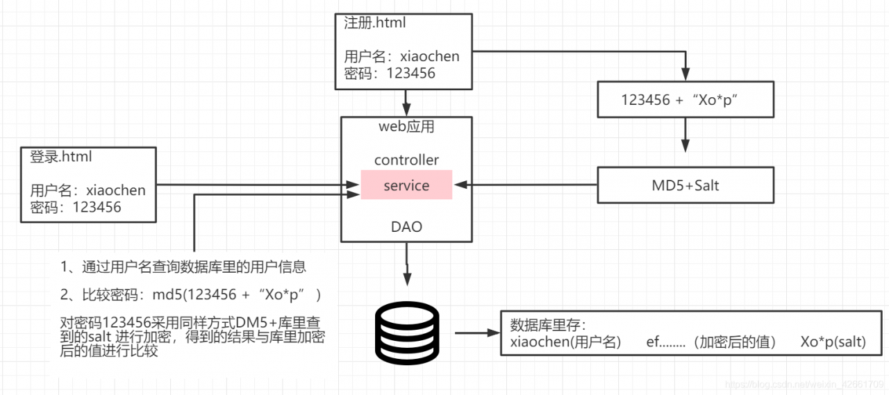 +salt(盐)的原因:防止被一些采用穷举算法的网站破解简单的密码。
