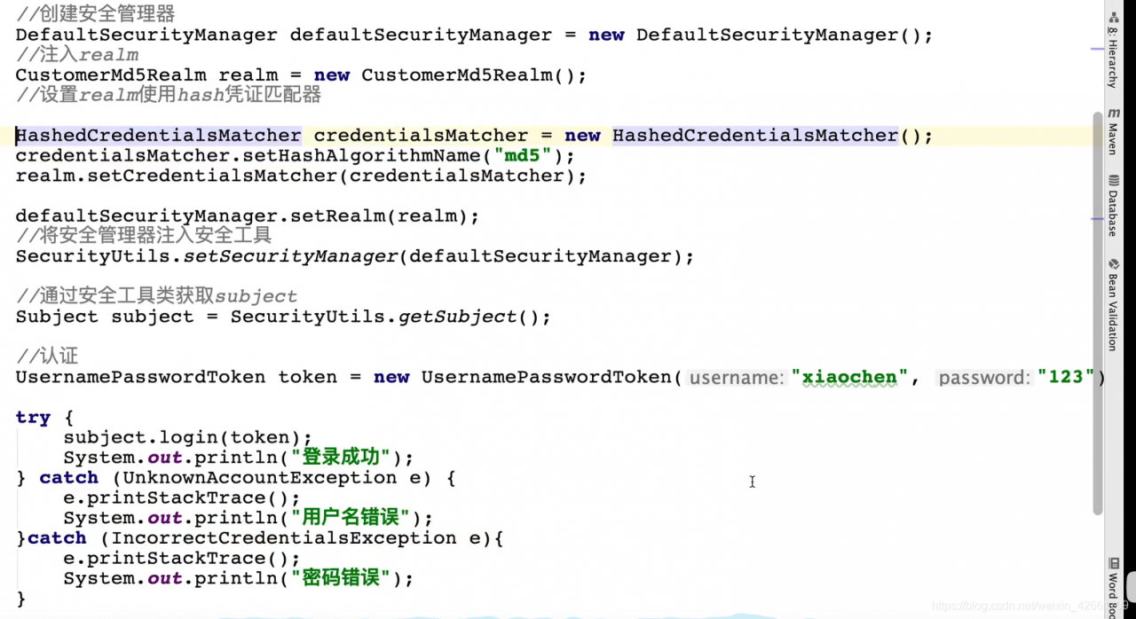 (shiro默认的Hash次数是1,Realm里自定义设置的次数不是1时,匹配器必须设置成一样的次数才可以!)