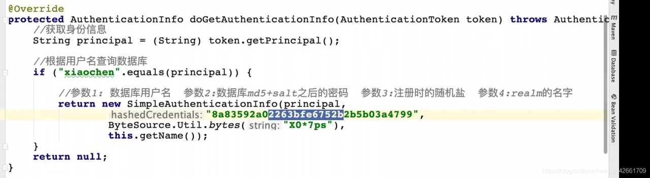 实际应用是将盐和散列后的值存在数据库中,自动realm从数据库取出盐和加密后的值由shiro完成密码检验。