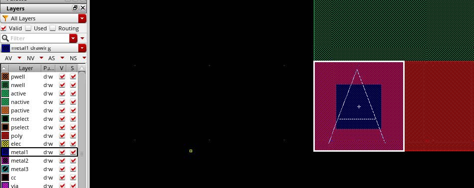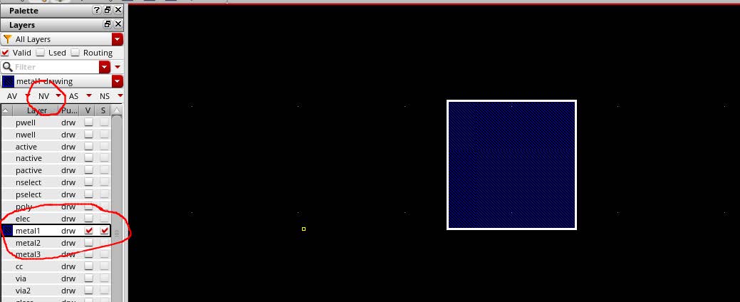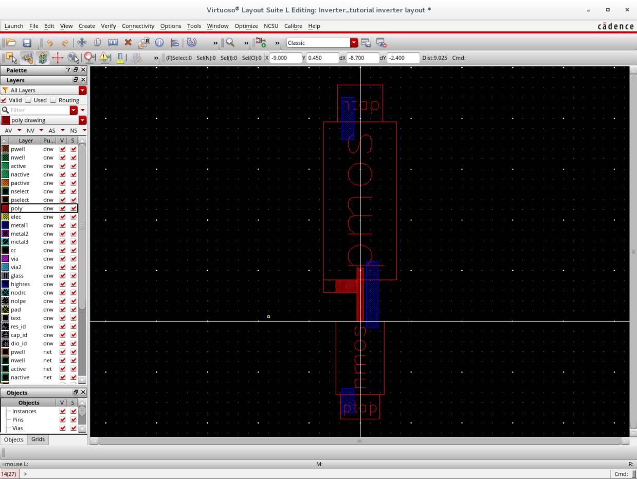 然后用metal1,和poly层连线,在LSW中选metal1/poly,然后快捷键r,画矩形