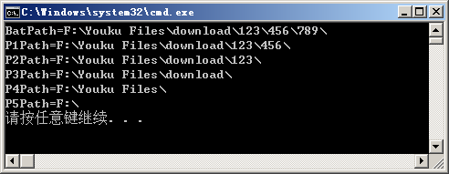 pause该bat在F:\Youku Files\download\123\456\789路径的测试结果如下: