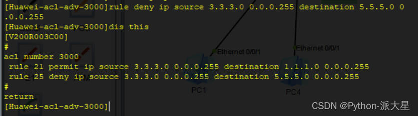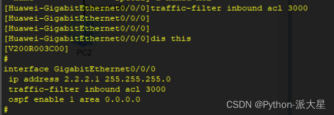//编号为4294967294的规则,默认允许所有数据通过(也就是没被前面规则拒绝的流量都会被允许通过【华为设备默认通过】【思科设备默认全部拒绝】)2、越精确的ACl规则越先写,规则号数越前,因为数据匹配到该规则后,就不会继续往下匹配。