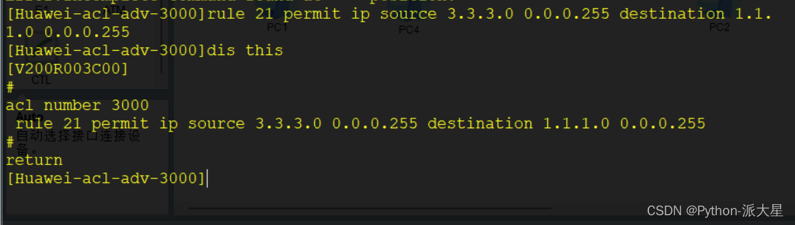 退出访问控制列表后,想要回到访问控制列表继续配置规则时,进入方式也是:acl 200