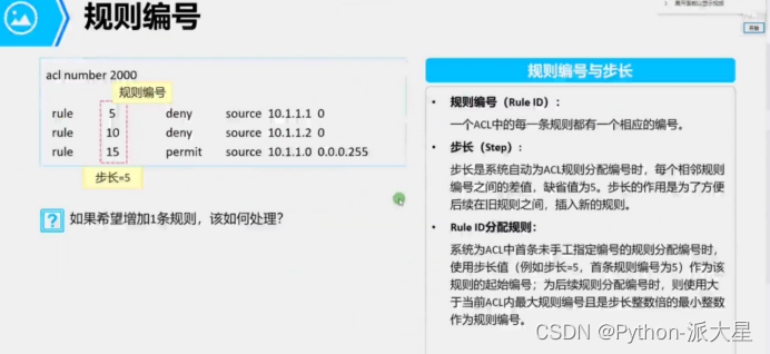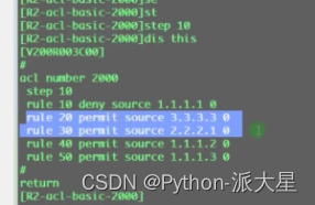 ACL由若干条permit或deny语句组成,每条语句就是该ACL的一条规则,每条语句中的permit或deny就是与这条规则相对应的处理动作。