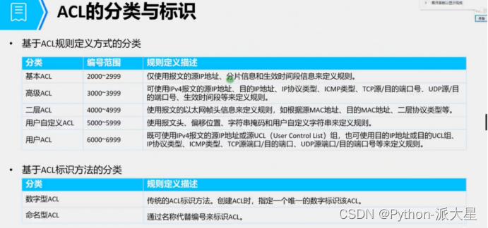 acl +ACL列表名创建acl访问控制列表时,使用数字编号在3000到3999这个范围,则创建的基本acl。以此类推。