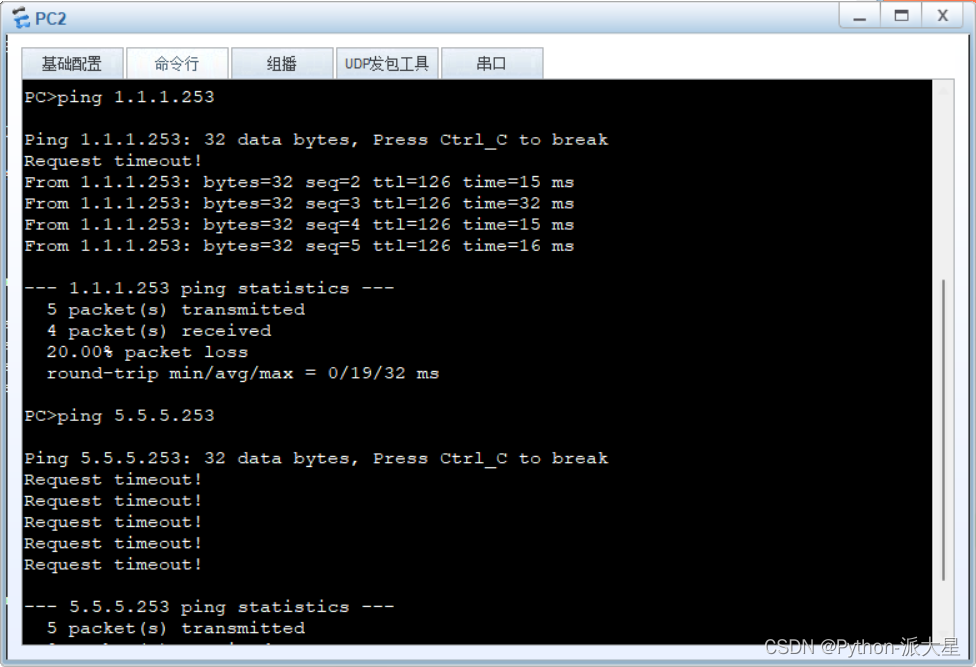 然后就可以实现3.3.3.0网段的pc机能与1.1.1.0网段的pc机通信,与3.3.3.0网段的pc机无法通信。