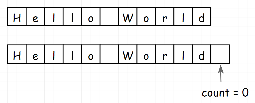 但这里可以取一个巧,我们可以通过一个 count 来记数,从第一个不为空格的数开始记起。换句话说,如果末尾处为空格,此时 count 值为 0,可以直接略过。