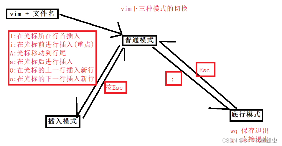 功能: 控制屏幕光标的移动,字符、字或行的删除,移动复制某区段。按i进入插入模式下,或者按 :到末行模式。