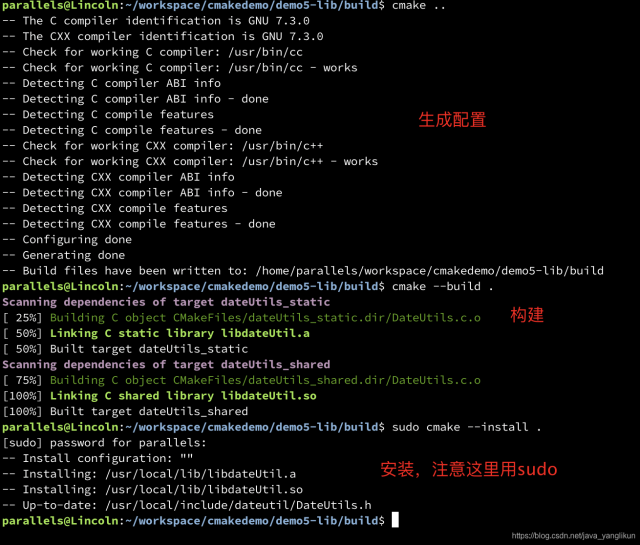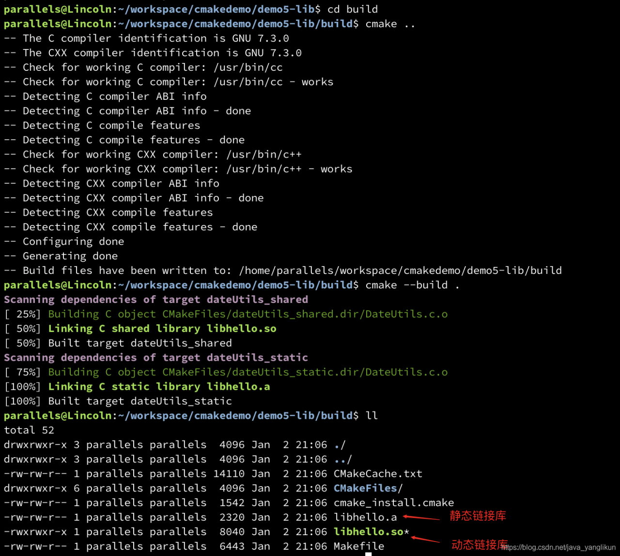 parallels@Lincoln:~/workspace/cmakedemo/demo5-lib$ ll
