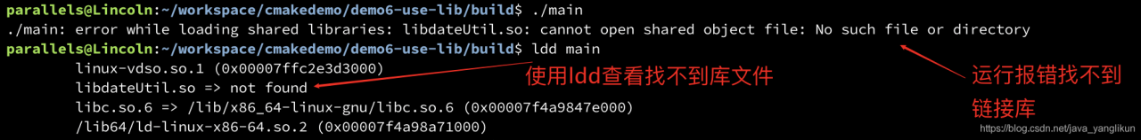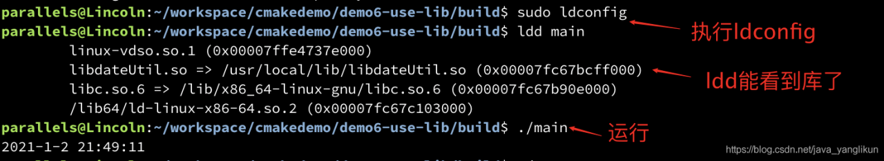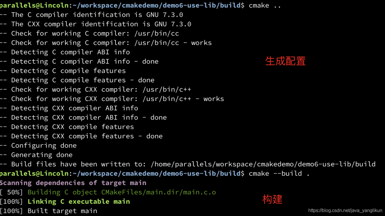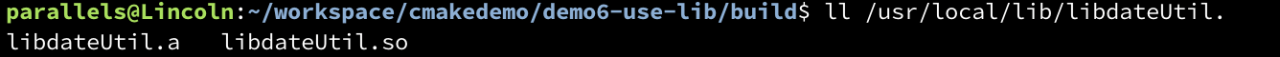 parallels@Lincoln:~/workspace/cmakedemo/demo6-use-lib$ ll