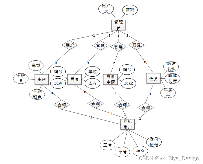 本系统根据第三范式的思想设计数据库,减少最大程度的冗余,总共建立有多个表,用户表、司机用户表、车辆管理表、路线管理表、任务管理表、尿素申请表、尿素管理表。