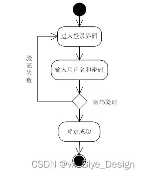 用户可进行登录使用更多功能,首先进入用户登录界面,输入用户账号和密码,后台对账号和密码进行核对验证,验证成功则页面直接显示登录用户昵称代表登录成功,否则返回用户登录界面。用户登录活动图如下图。