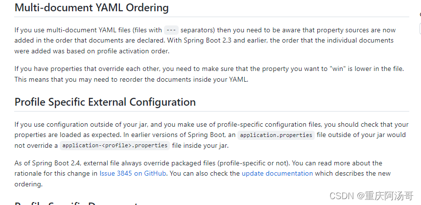 如果你在yaml配置文件中使用了间隔符---来声明多文档的话,你得知道现在按文档声明的顺序来注册声明的配置属性;而在 Spring Boot 2.3 及更早版本中,基于配置文件激活顺序。举个例子:
