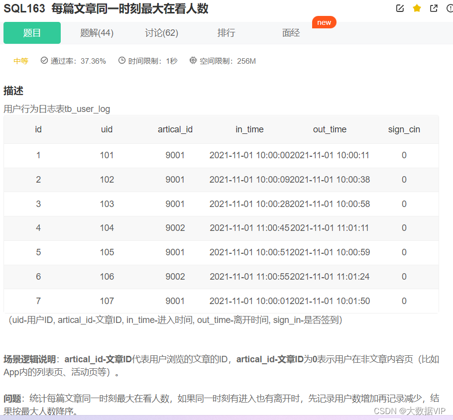 标记进入时间为1,退出时间为-1,通过union all将两个标记好的表格合并成一张表格,通过sum()over()窗口函数,可以求出在线人数。最后通过max聚合函数,求出最大的在线人数。具体题目跟代码实现如下: