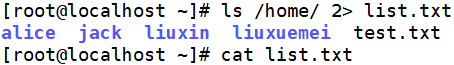 [root@localhost ~]# ls /home/ 2> list.txt